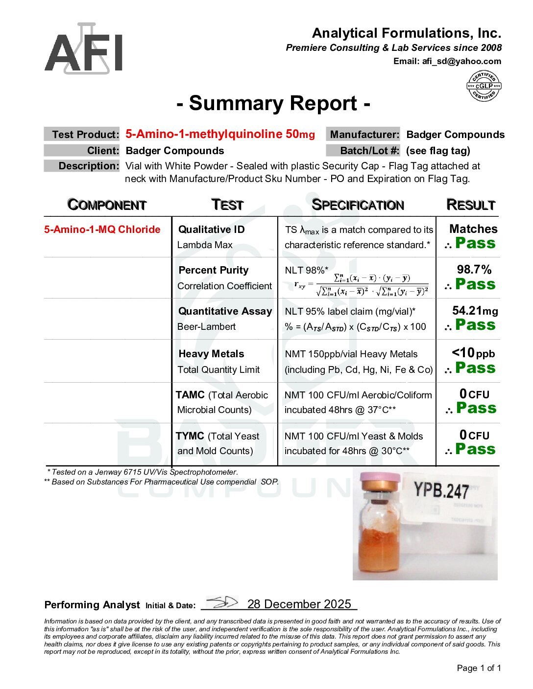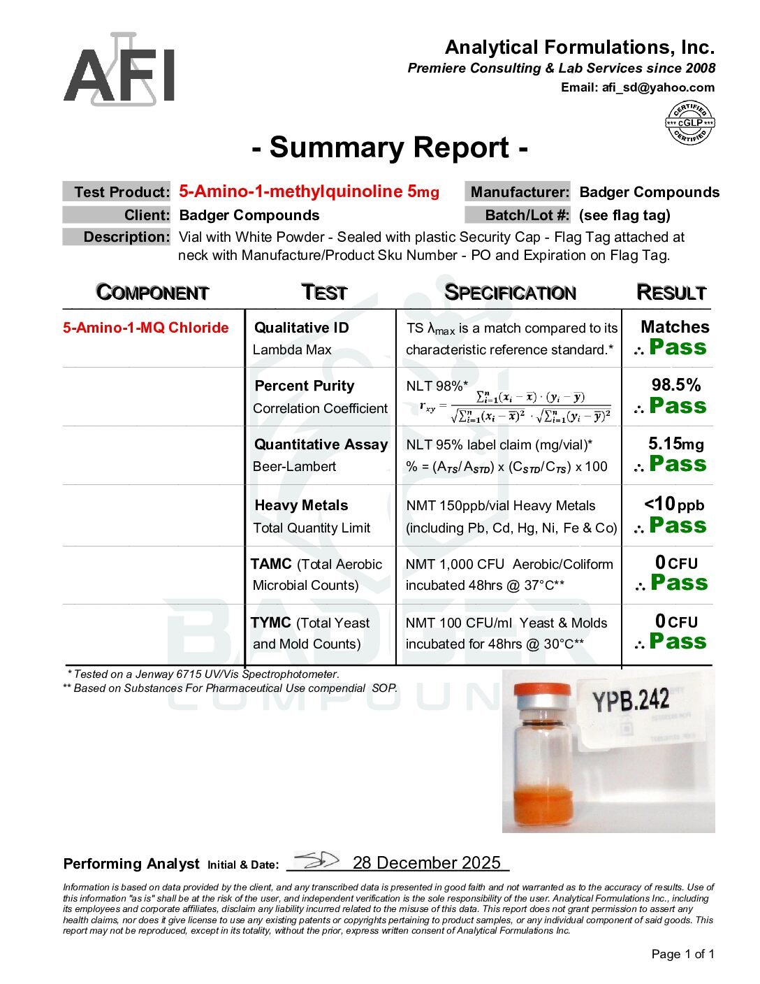 • 5mg vial 5-Amino-1MQ with Badger Compounds Logo