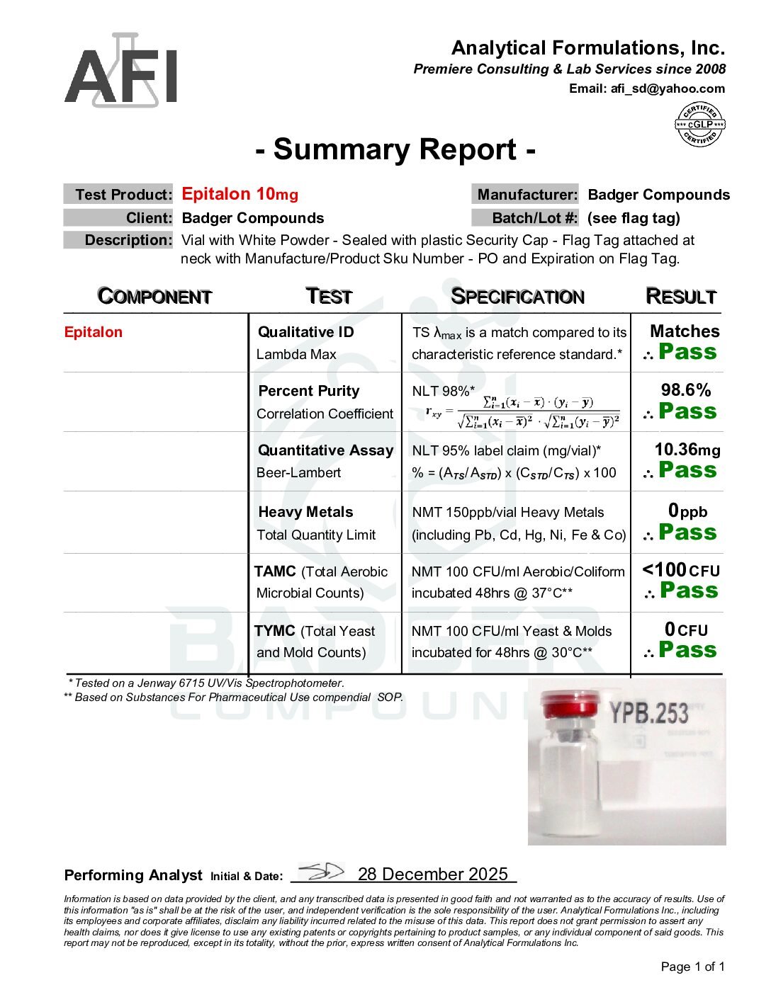 By purchasing from Badger Compounds, the buyer affirms that they are a qualified researcher or institution with the appropriate training, facilities, and authorization to handle, store, use, and dispose of research chemicals in compliance with all applicable federal, state, and local laws and regulations. All sales are final. Badger Compounds assumes no liability for misuse, improper handling, or any consequences arising from the use of this product.