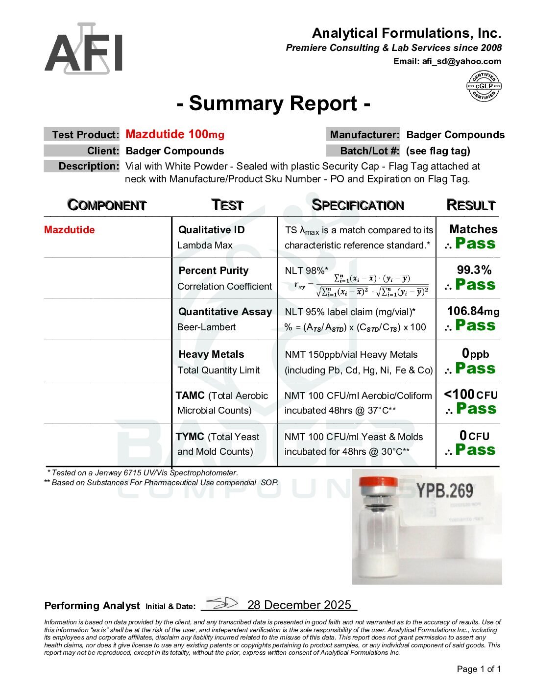 By purchasing from Badger Compounds, the buyer affirms that they are a qualified researcher or institution with the appropriate training, facilities, and authorization to handle, store, use, and dispose of research chemicals in compliance with all applicable federal, state, and local laws and regulations. All sales are final. Badger Compounds assumes no liability for misuse, improper handling, or any consequences arising from the use of this product.