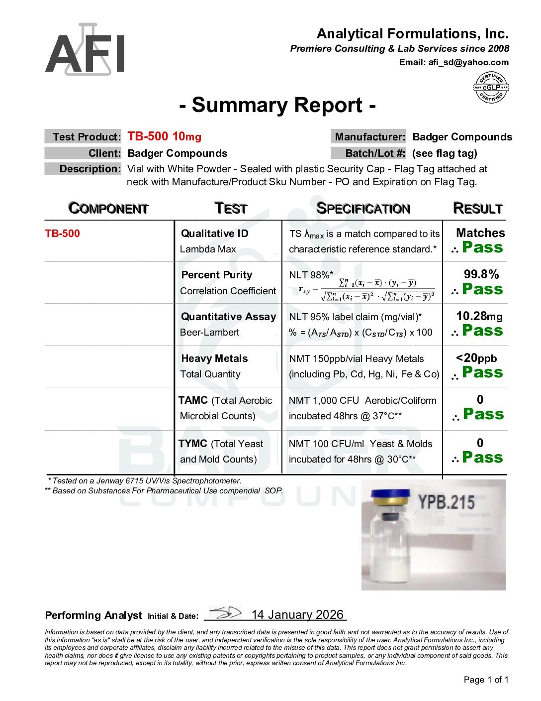 By purchasing from Badger Compounds, the buyer affirms that they are a qualified researcher or institution with the appropriate training, facilities, and authorization to handle, store, use, and dispose of research chemicals in compliance with all applicable federal, state, and local laws and regulations. All sales are final. Badger Compounds assumes no liability for misuse, improper handling, or any consequences arising from the use of this product.
