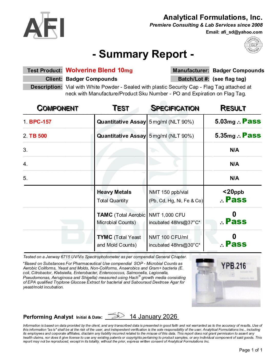 Wolverine Blend is a research peptide formulation combining TB-500 and BPC-157, two synthetic peptides that have been widely examined in controlled in vitro research settings. Scientific investigations have explored these peptides for their involvement in tissue-related signaling processes, angiogenesis-associated pathways, and inflammatory signaling mechanisms at the molecular level. This blend is supplied exclusively for research and analytical purposes and is not intended for human or veterinary use. Peptide Blends consist of multiple research compounds combined within a single vial for use in controlled laboratory and in vitro research environments.